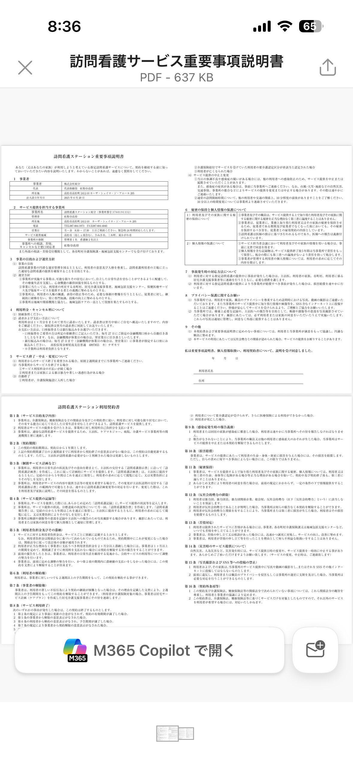 ・基本的に1〜3割負担(介護保険負担割合証に記載) ・サービス提供時間により変わります。 ・これに加えて緊急訪問などの加算がある場合は料金が上がります。 ・所得に応じて、自己負担額に上限があり、超えた分は払い戻されます。(高額介護サービス費) |